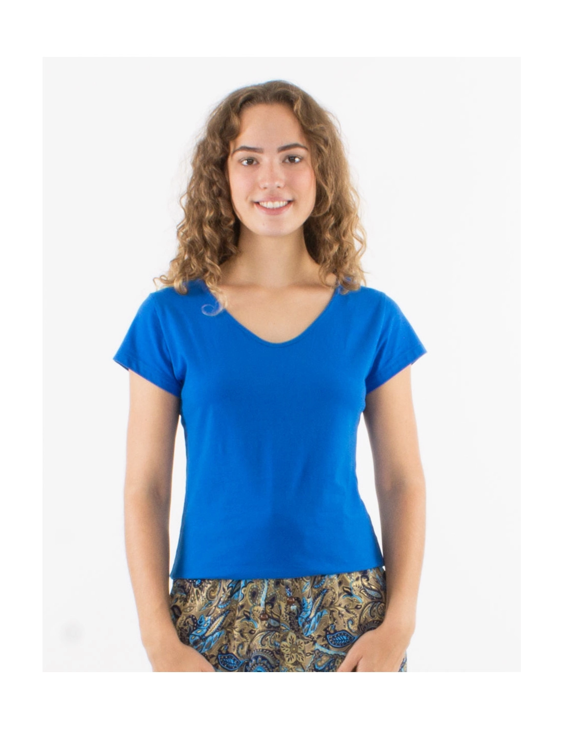 Women's blue T-shirt in stretch cotton with V-neck
