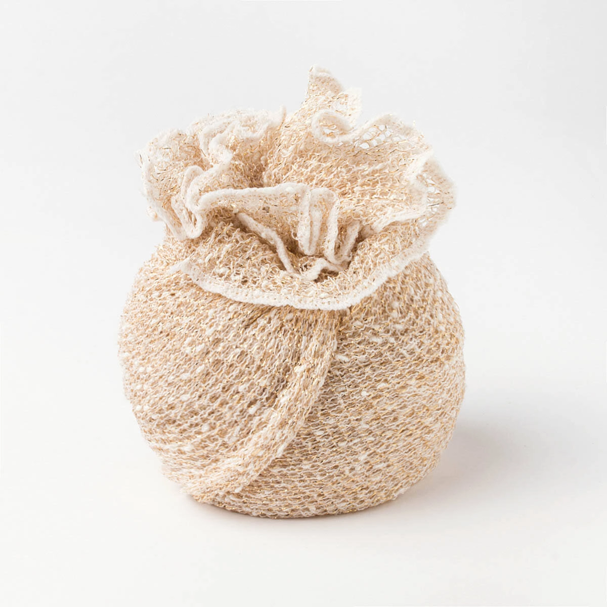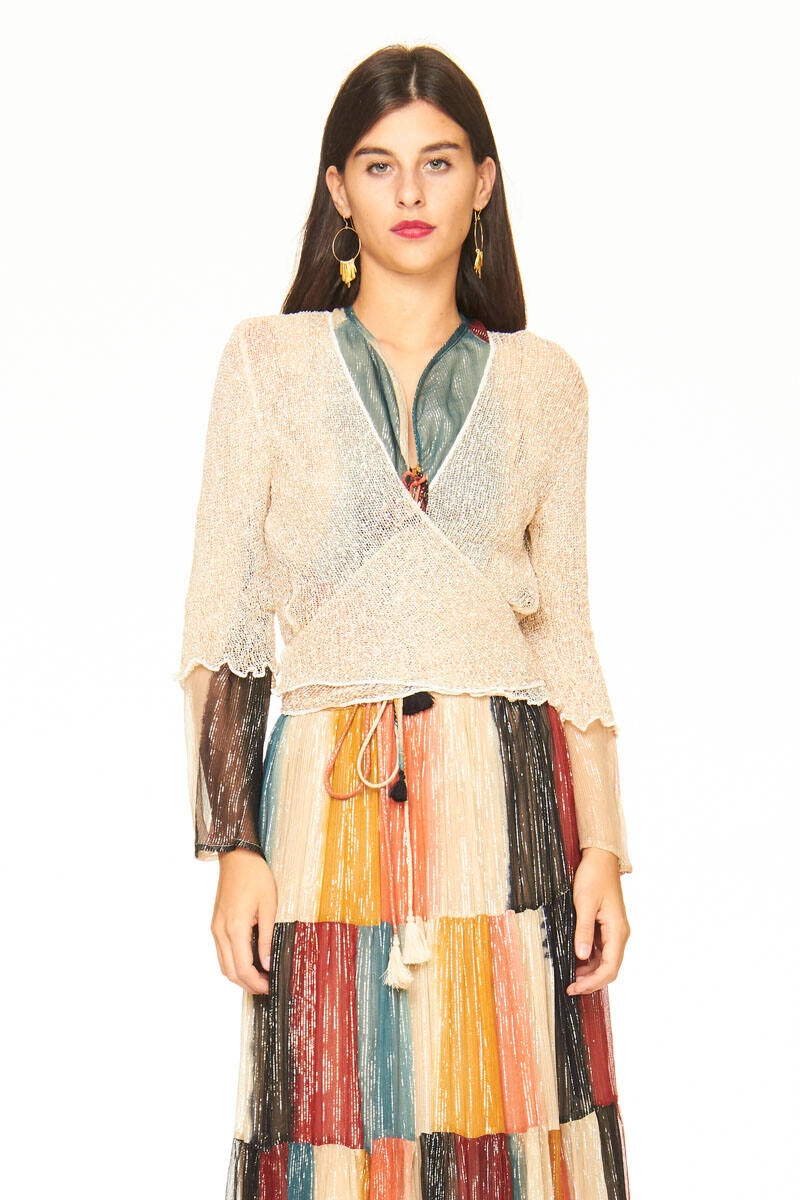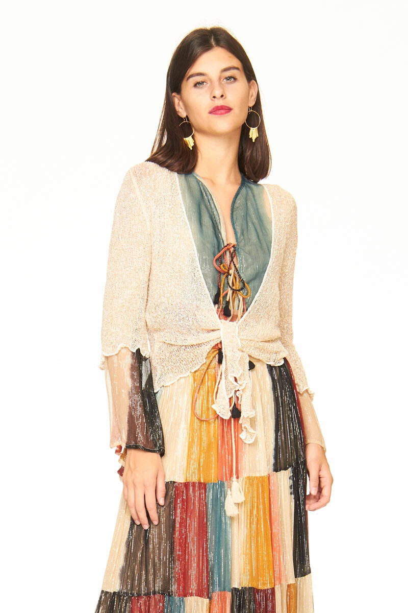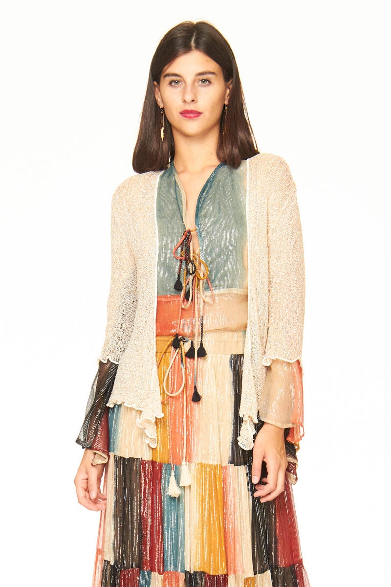 Rayon netted bolero with coconut white base and gold lurex thread. Lightweight model, to be worn open or tied at the front.