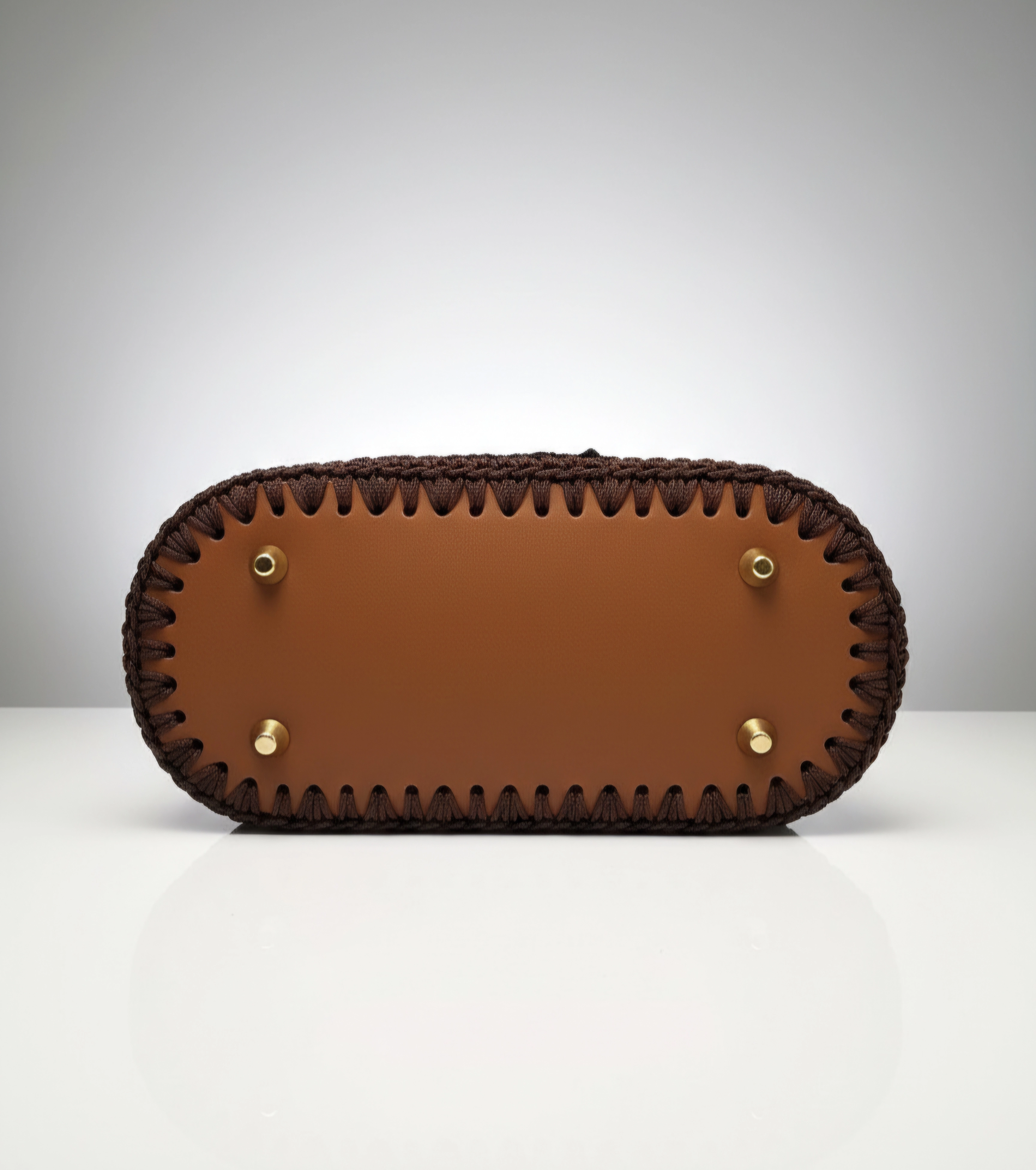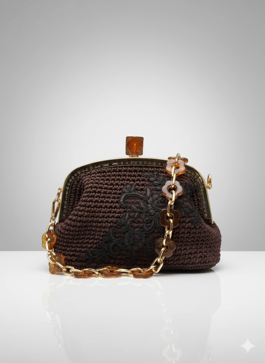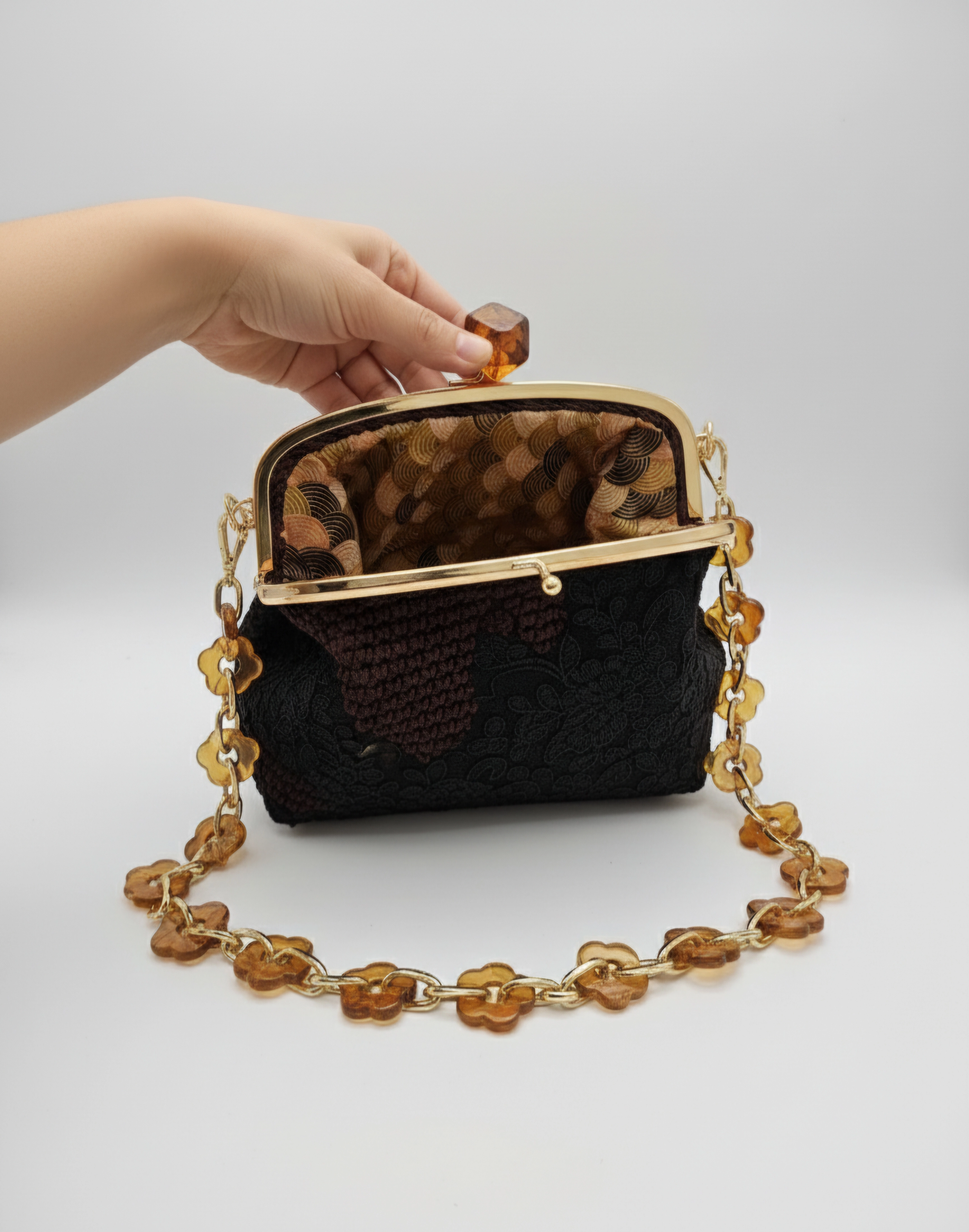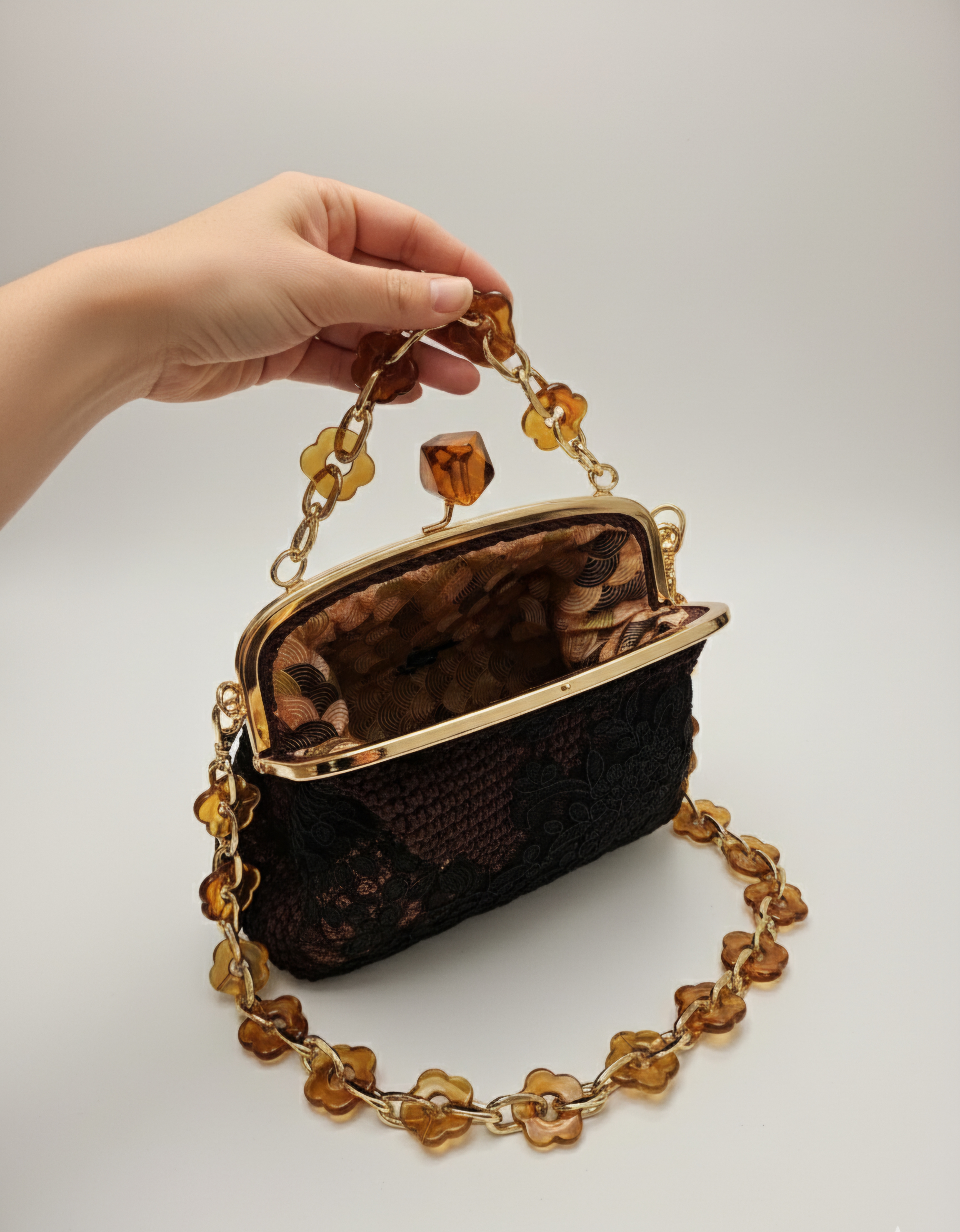 Artisanal brown bag handcrafted in Thai cord with lace appliqués on both sides, creating a refined and elegant effect. The structure is completed with a rigid eco-leather base with protective feet, providing stability and elevating the quality of the bag. The interior is fully lined and it features a removable decorative shoulder strap, 60 cm long, allowing it to be worn on the shoulder or carried by hand depending on the occasion. The top clasp closure adds a vintage-inspired touch, perfect for ceremonies, events or to elevate a daytime outfit with a classy accessory.