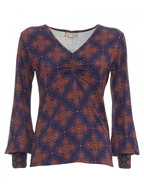 Soft fabric sweater with a geometric pattern and a slightly gathered V-neck that adds movement to the front. The contrasting cuff adds a decorative detail that distinguishes the piece. The comfortable fit is suitable for a variety of body types, ideal for a casual-chic everyday look.