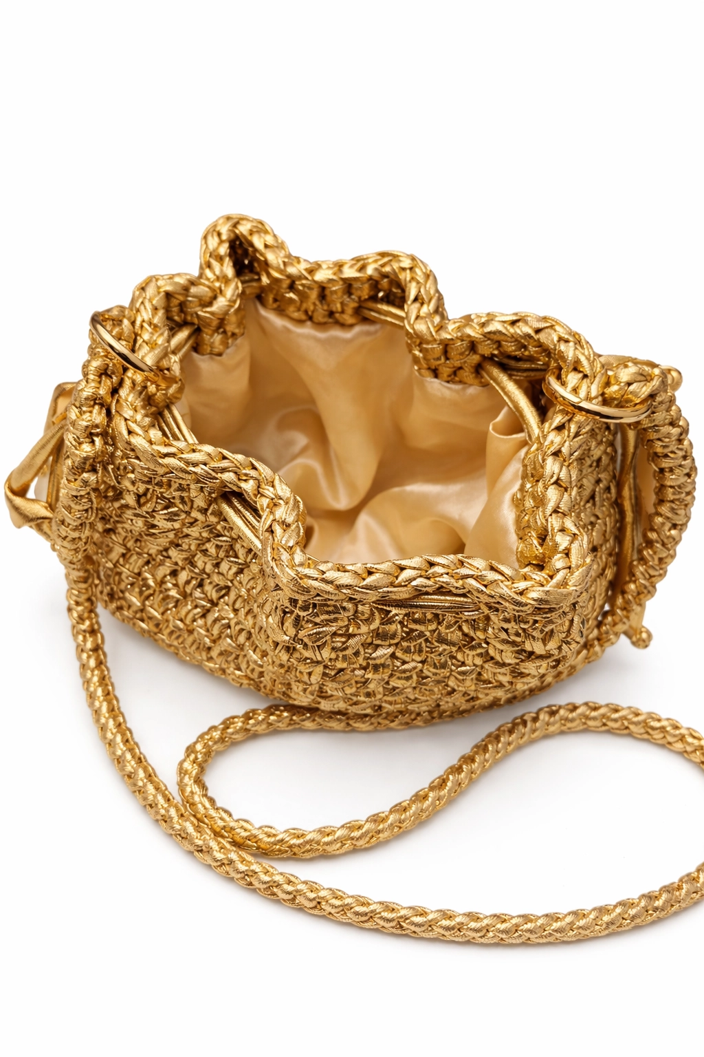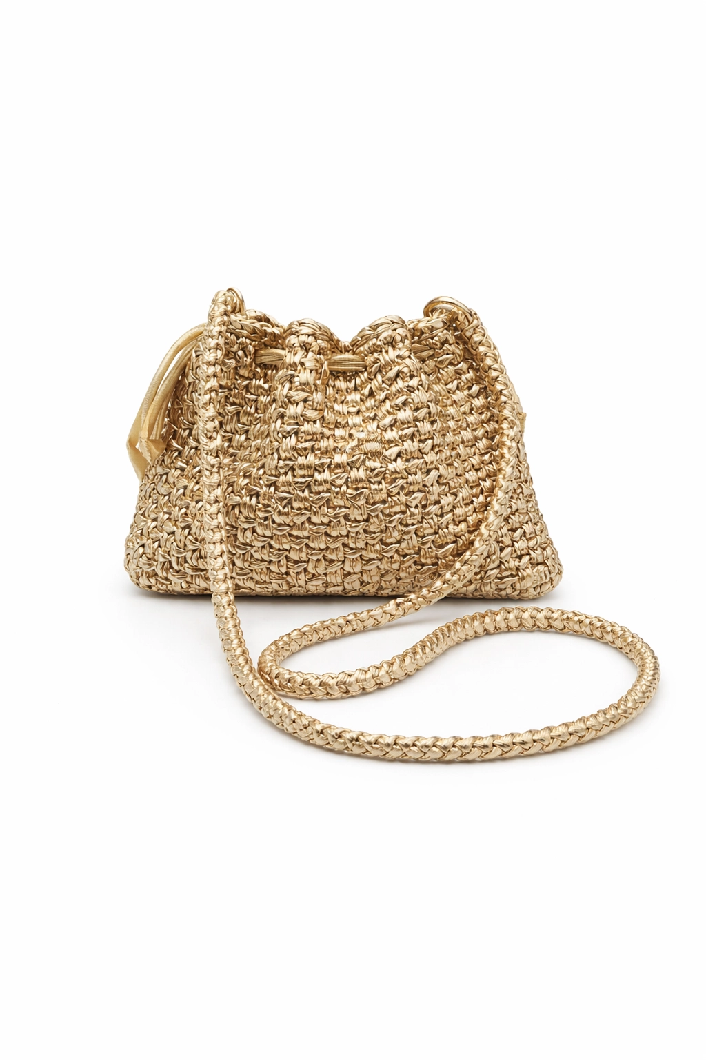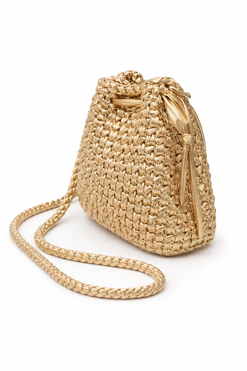 Handmade crochet pouch bag crafted in metallic champagne yarn, featuring a dense and regular woven-style stitch with a contemporary feel. The clean, essential design highlights the artisan texture, creating a refined effect suitable for both daytime and evening wear.