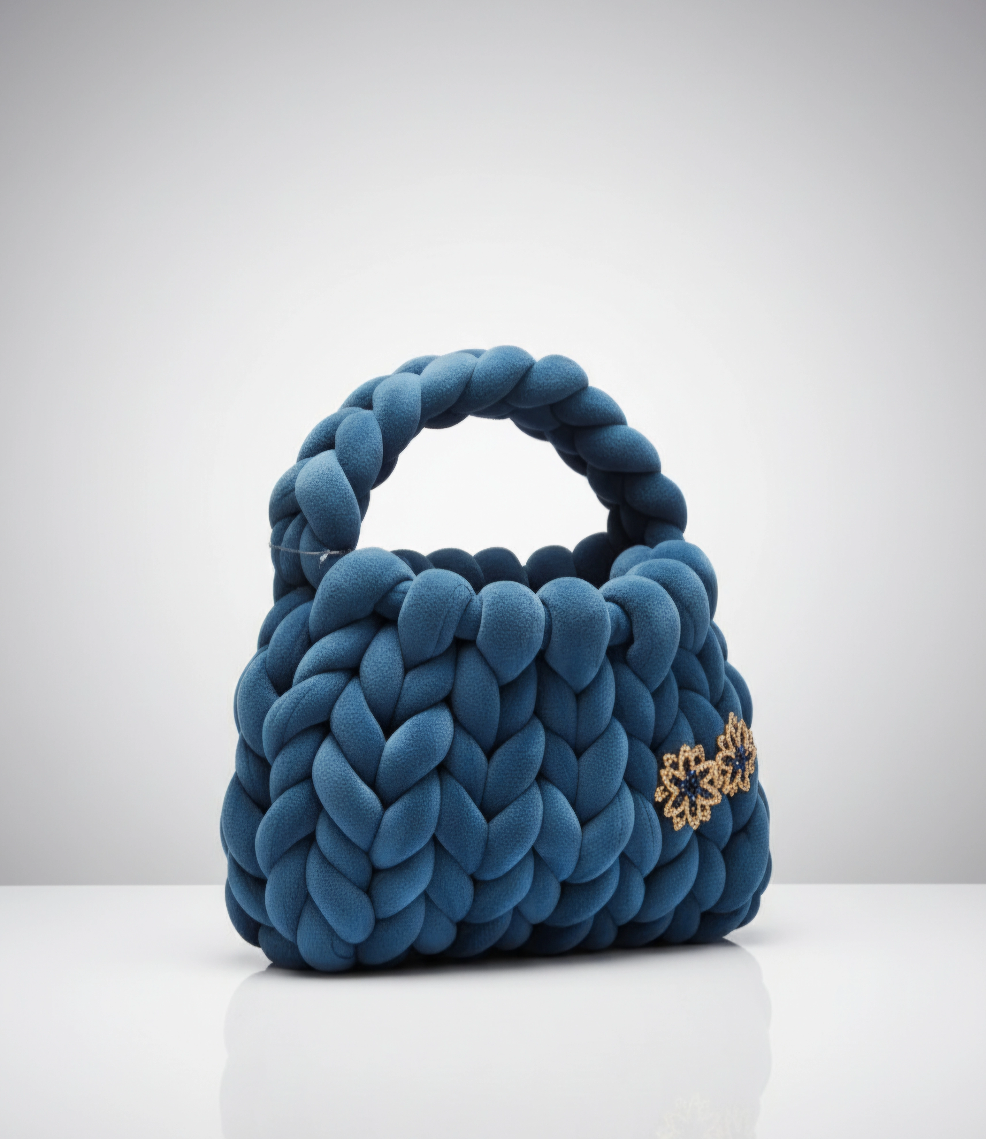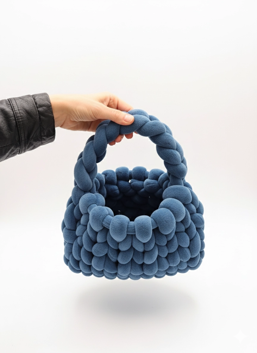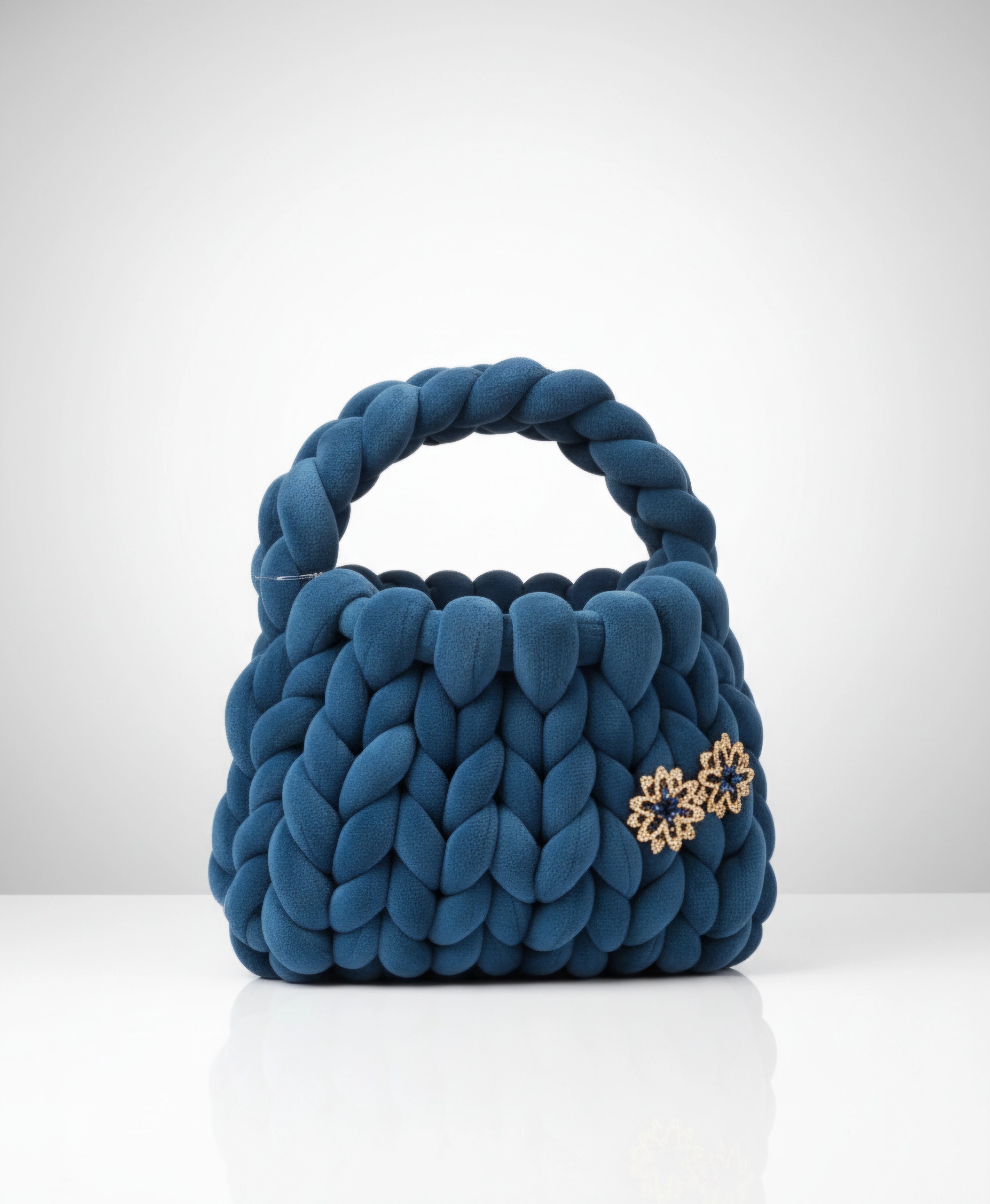 Handcrafted bag made entirely by hand in soft blue velvet with chunky woven texture that creates a voluminous and enveloping effect. The handle is made in the same marshmallow yarn as the body of the bag, offering a coordinated and on-trend design. The model is unlined to highlight the woven structure and the authenticity of the artisanal workmanship. The bag is embellished with a removable beadwork brooch with crystals, adding a touch of light and personalisation to the accessory. Artisanal product made in Italy, ideal for those looking for a unique bag, perfect for winter outfits and refined looks.