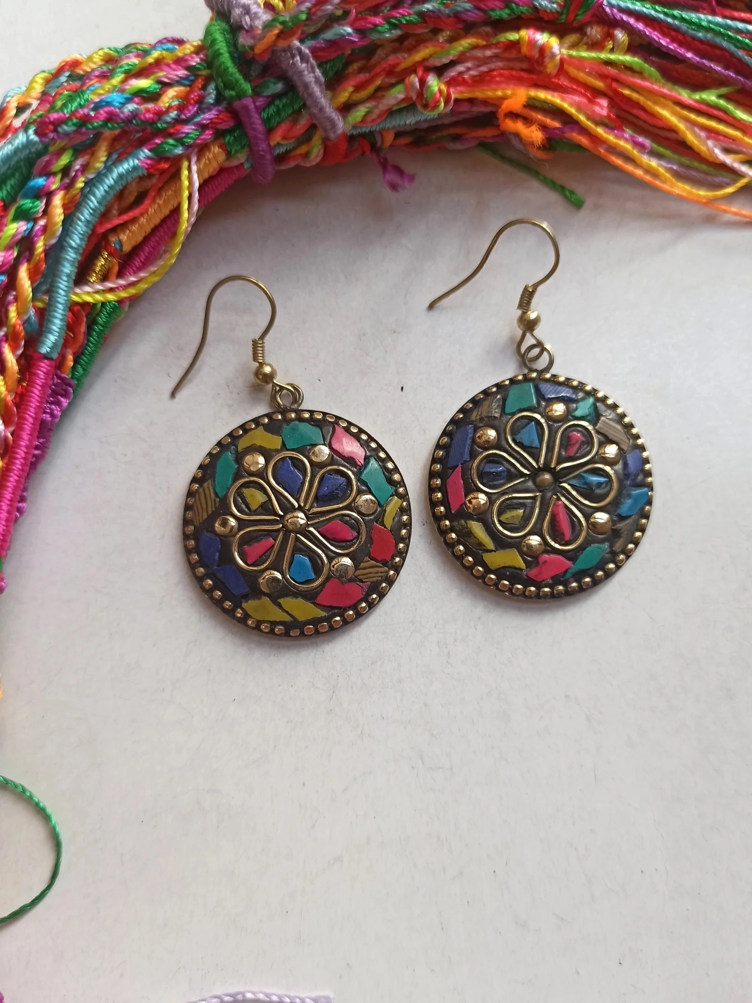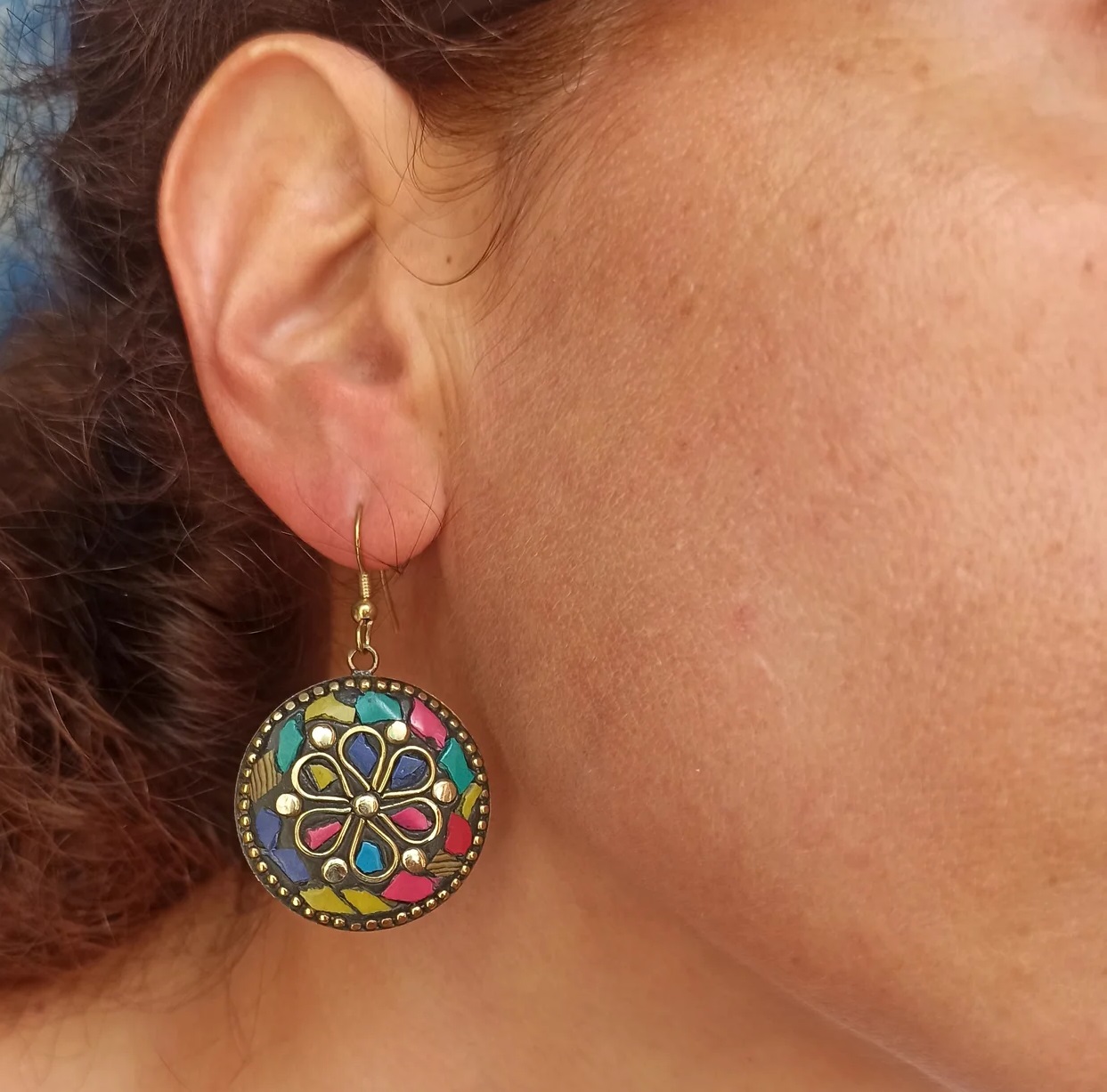 Ethnic Nepalese metal alloy earrings, round shape, with mosaic chips in various colours. Length approx. 5 cm. Made in Nepal. One piece. Lightweight and Nickel-free.