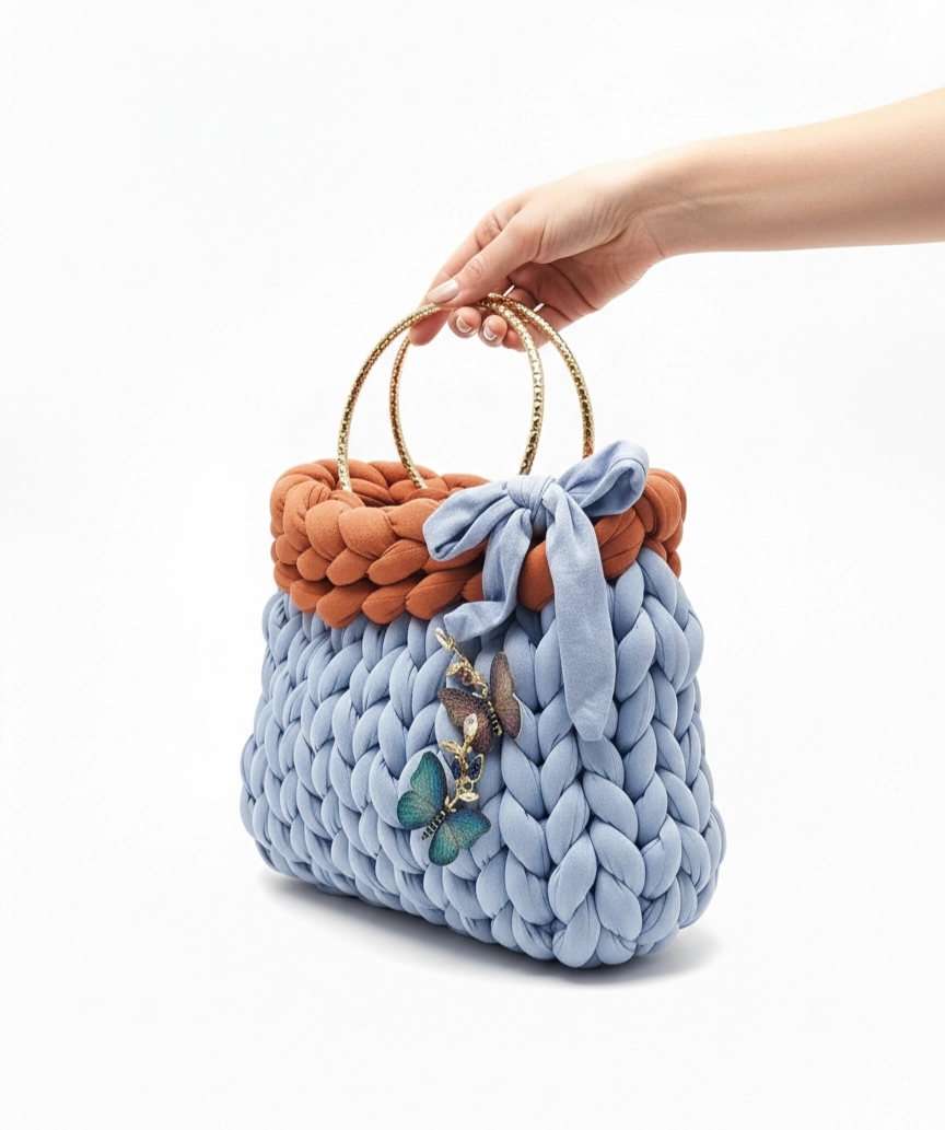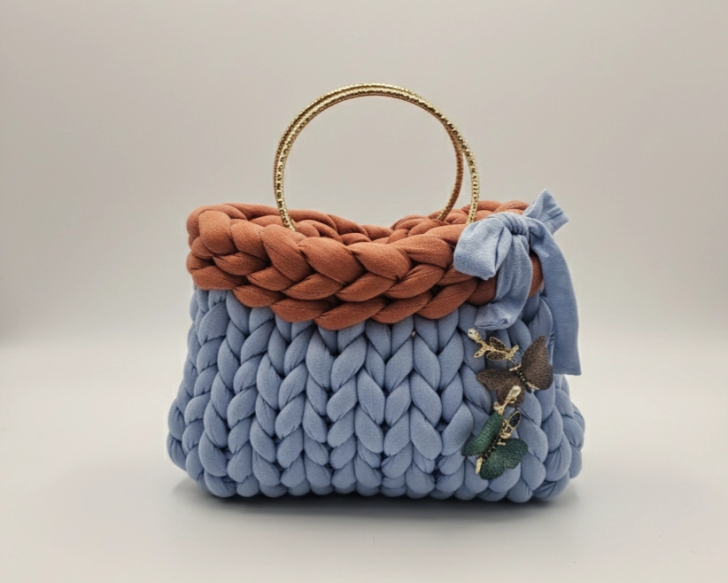 This medium-sized chunky bag is entirely handcrafted using a manual weaving technique that creates a voluminous, bold, and structured effect, making it extremely pleasant to the touch. The bag is crafted from high-quality cotton-feel yarn in sophisticated rust and blue tones, meticulously woven to achieve a compact texture that enhances its volume and harmoniously defines its silhouette.