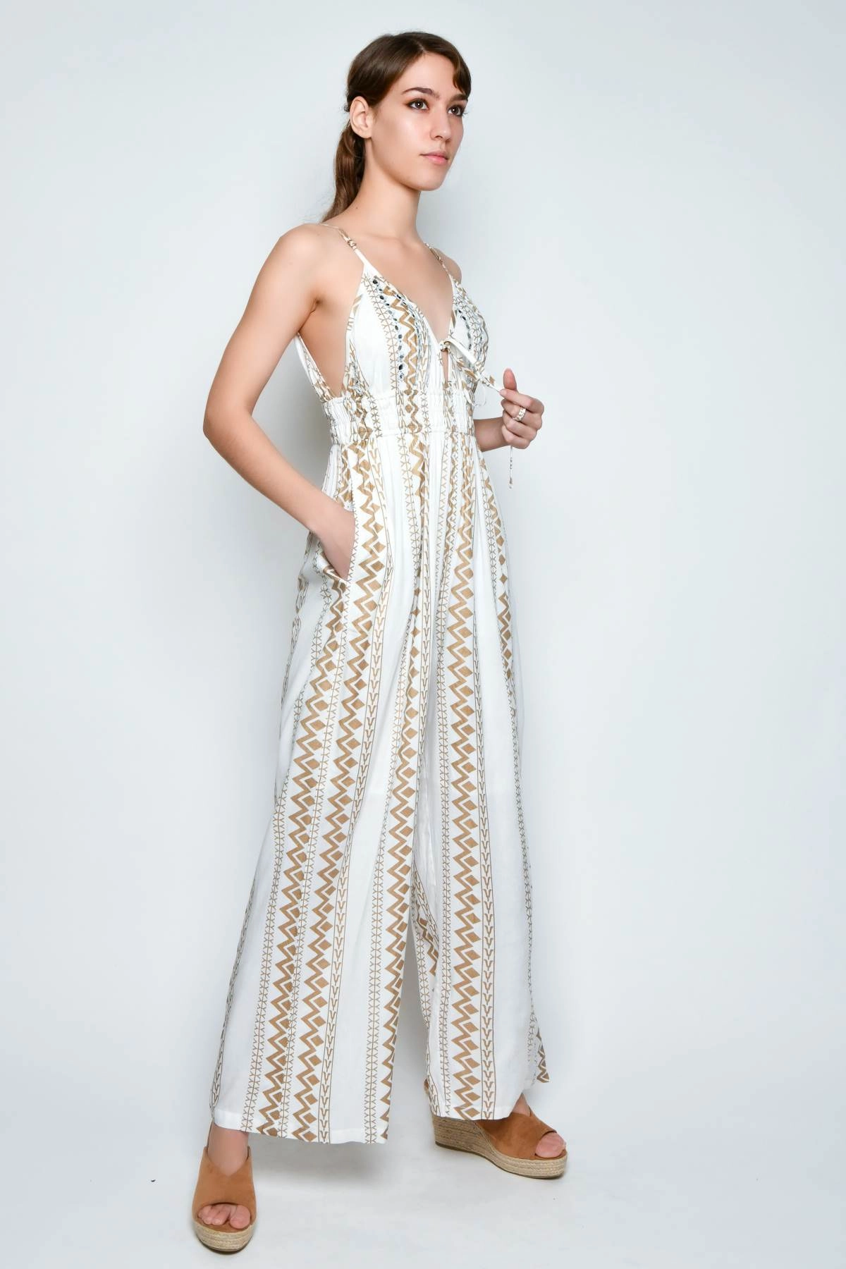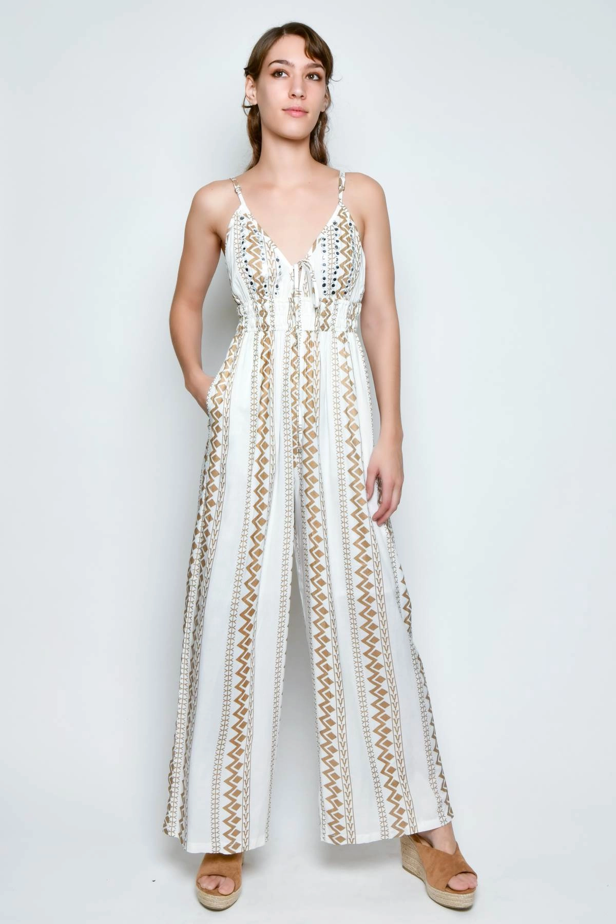 White jumpsuit with ethnic patterns and embroidery. The model features a V neckline both at the front and back, adjustable straps and an elastic bodice that ensures a comfortable fit. The pants have a soft, fluid shape and include practical side pockets.