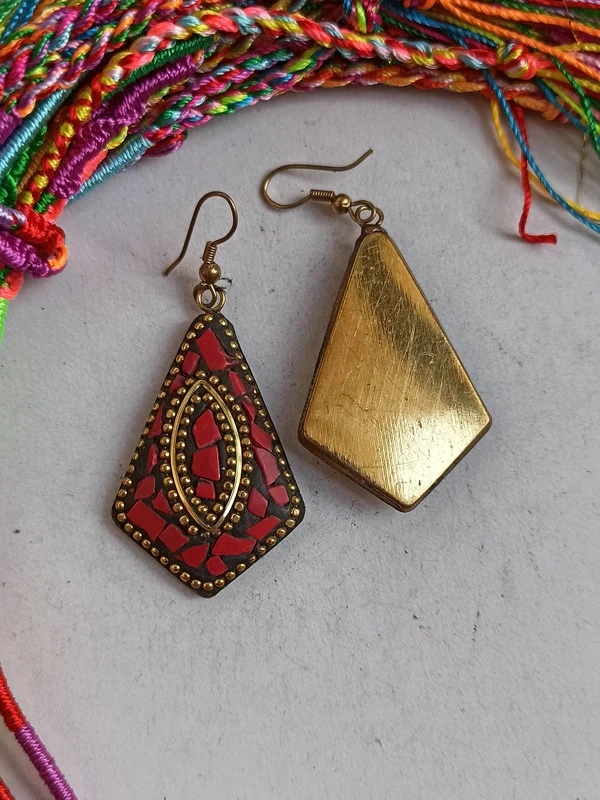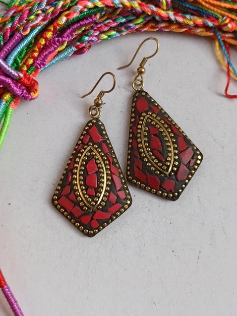 Ethnic Nepalese earrings made with red chip mosaic. Length 6 cm approx. Made in Nepal.