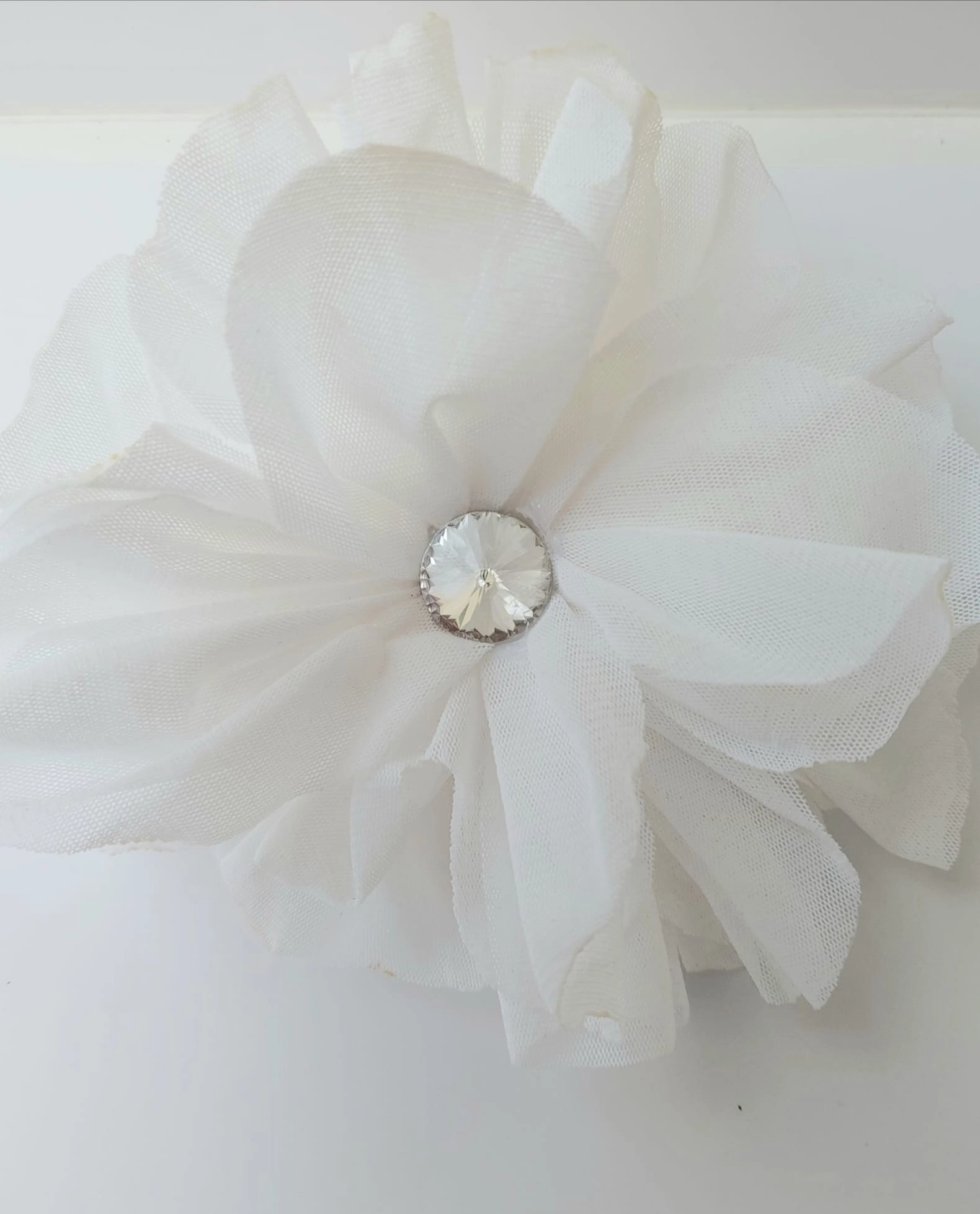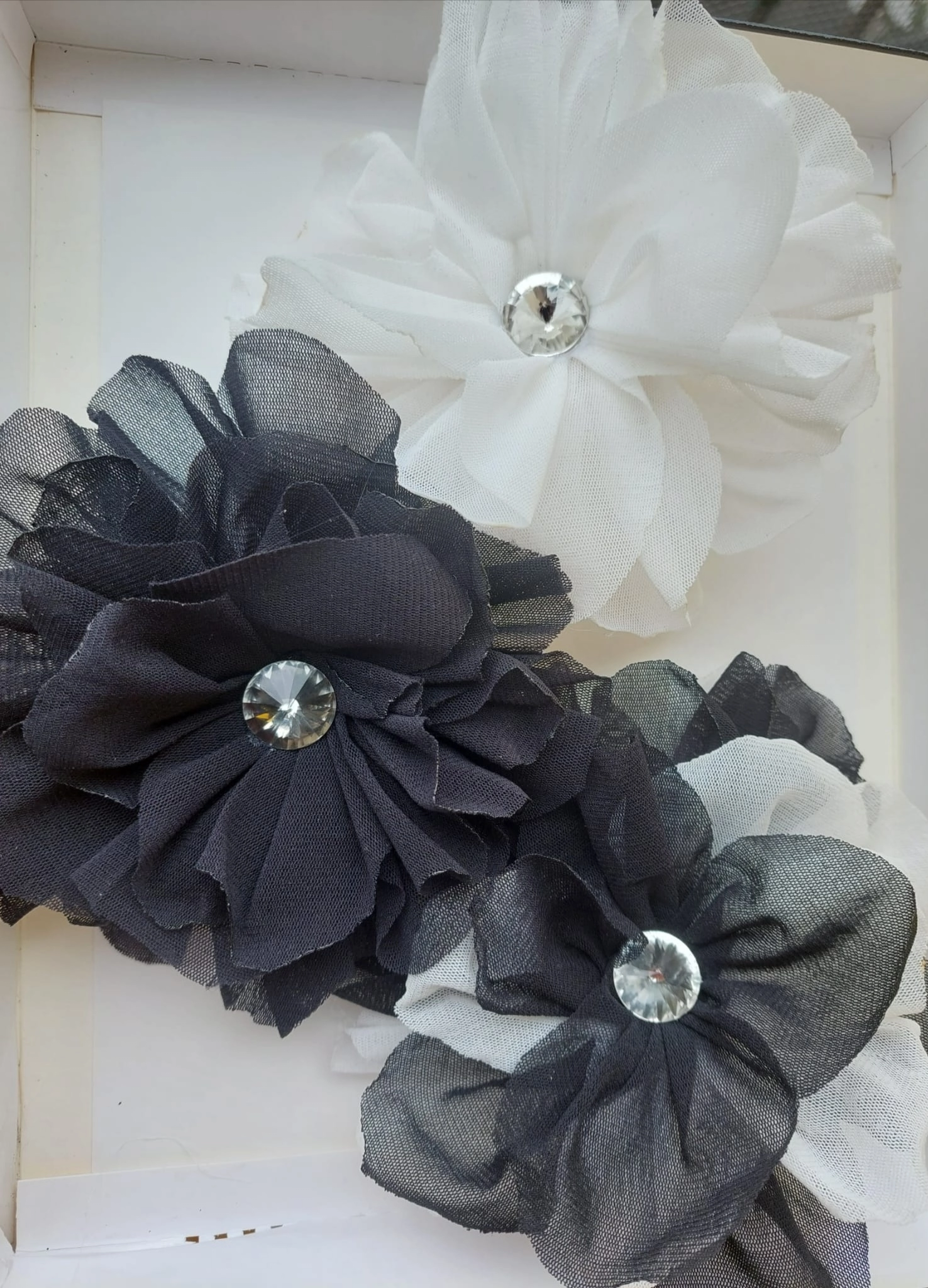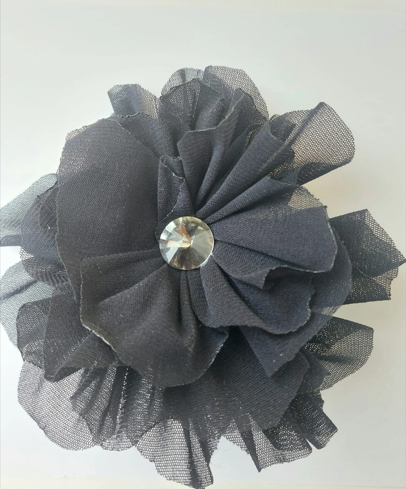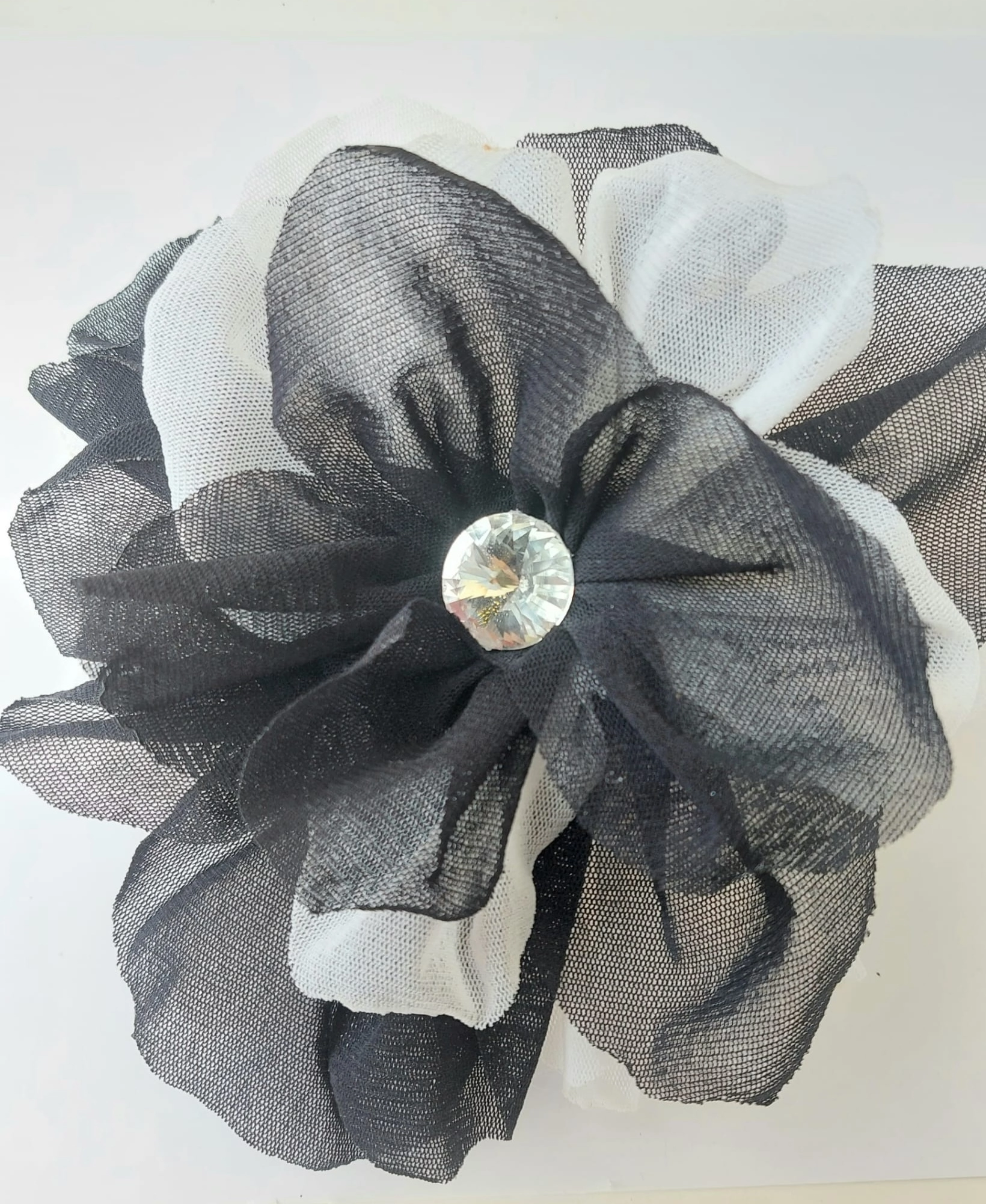 Handmade brooches made with " trastullami i nastri di Mirta ". Central crystal. Diameter 15cm approx. Available colors: black - white - white/black.