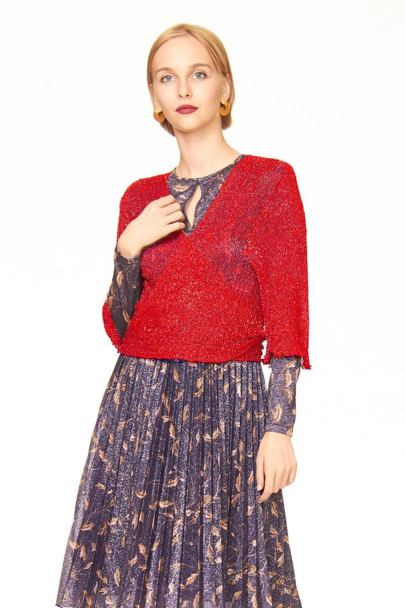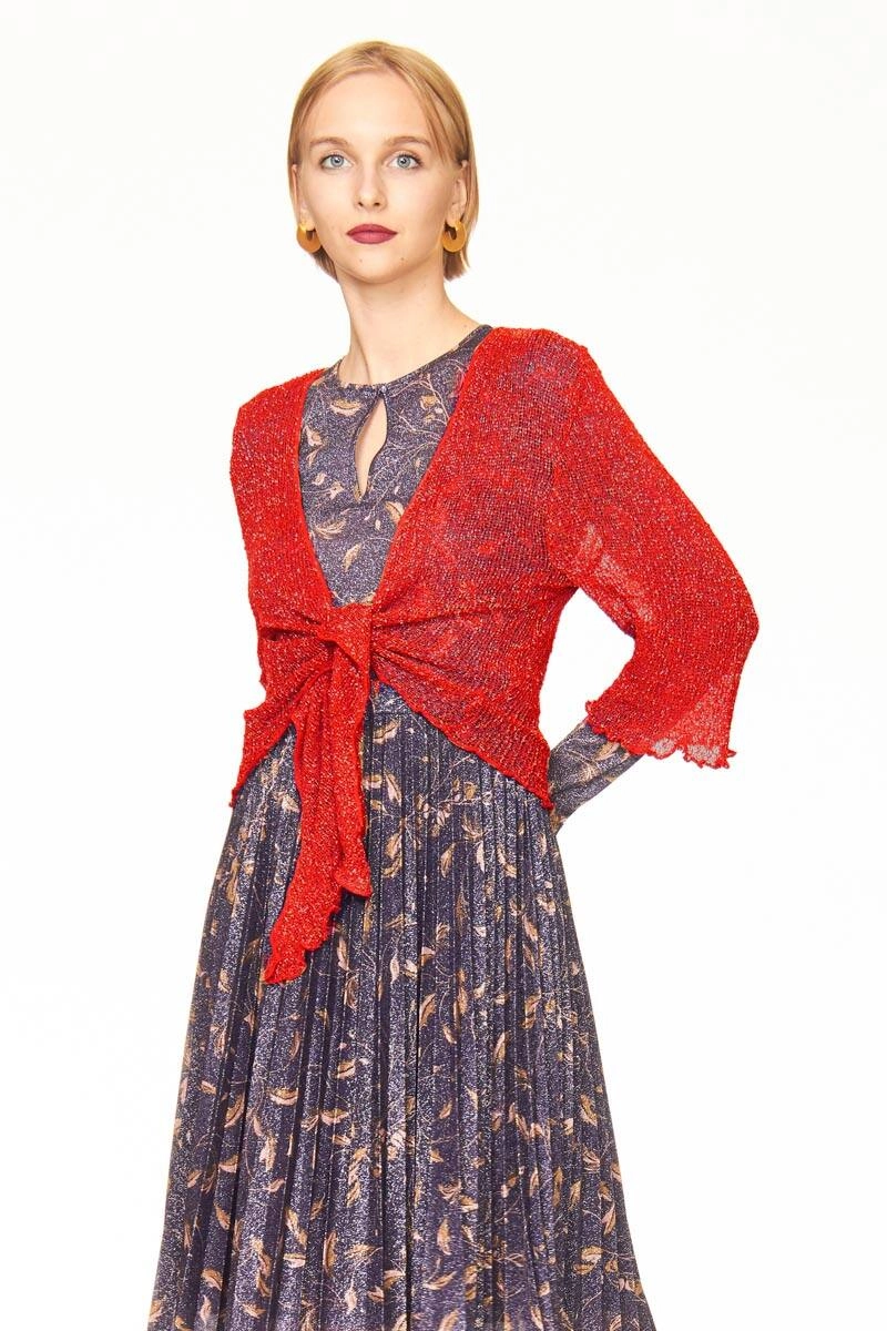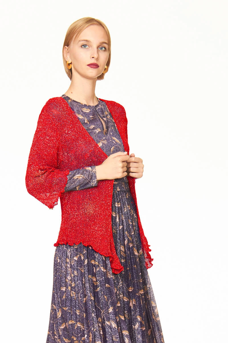 Gold Red Passion Shrug in rayon, a versatile garment for any occasion. Perfect for completing casual or evening outfits, it can be worn open or tied. The mesh texture provides lightness and comfort, while the Gold Red Passion color with gold Lurex inserts adds a touch of personality to your look.