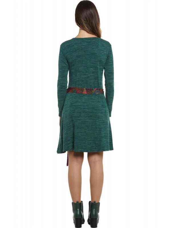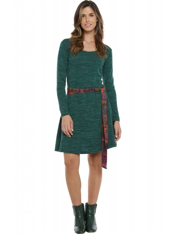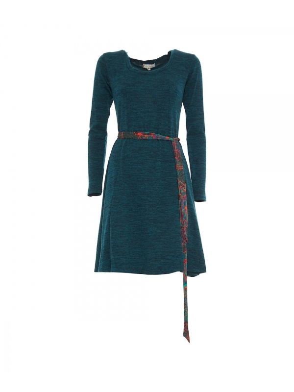 Winter flared dress with a loose fit and a round neckline finished in the same fabric and color as the sleeves. The removable patterned fabric belt allows for a customizable fit and can be worn or removed as desired. Made of warm and comfortable fabric, it is available in two colors, green and teal, and in two sizes (see size guide). A versatile piece for casual and everyday looks.
