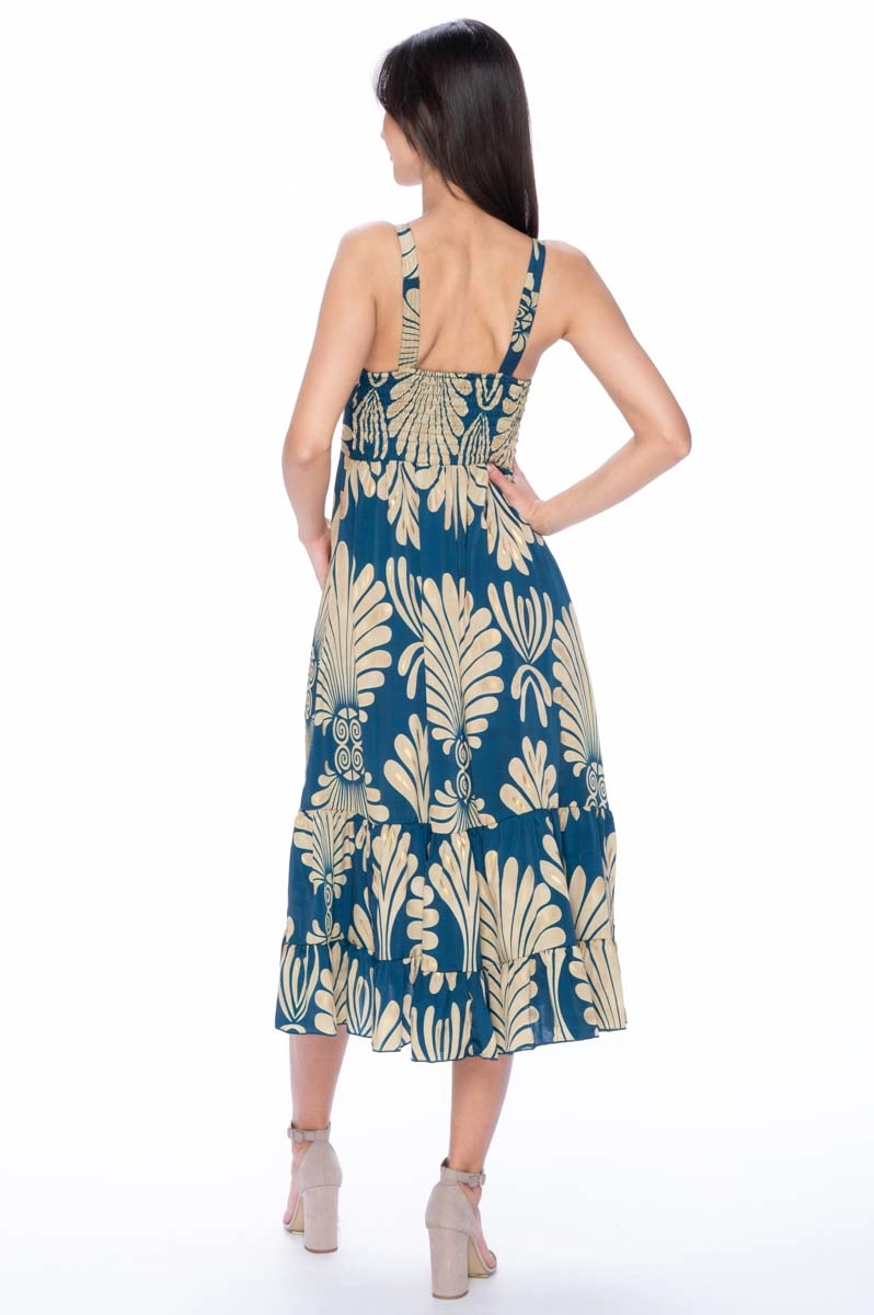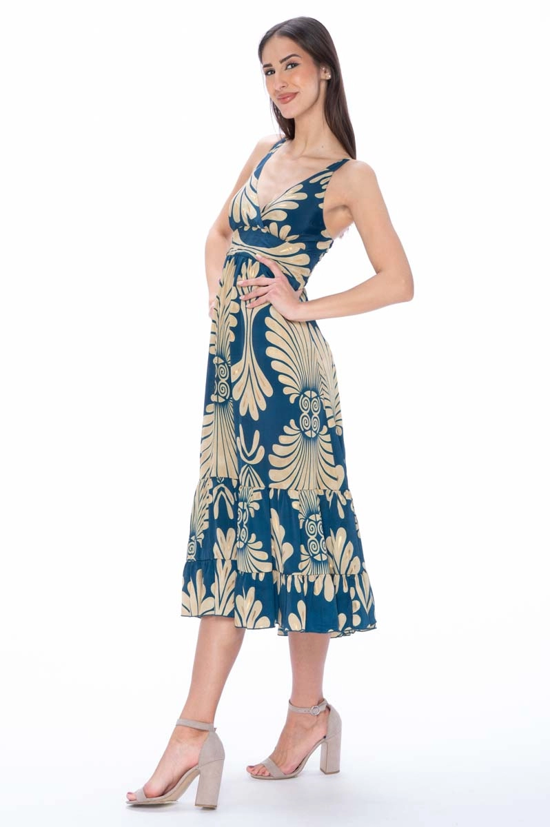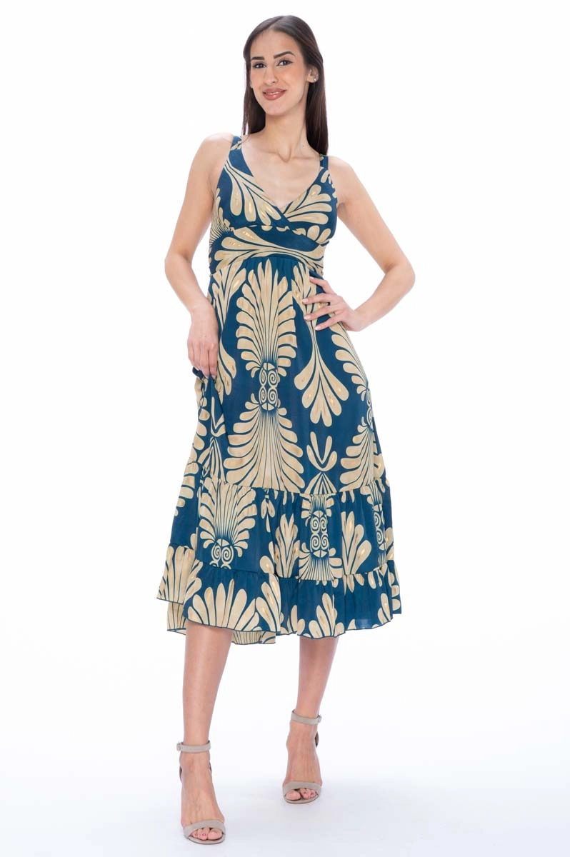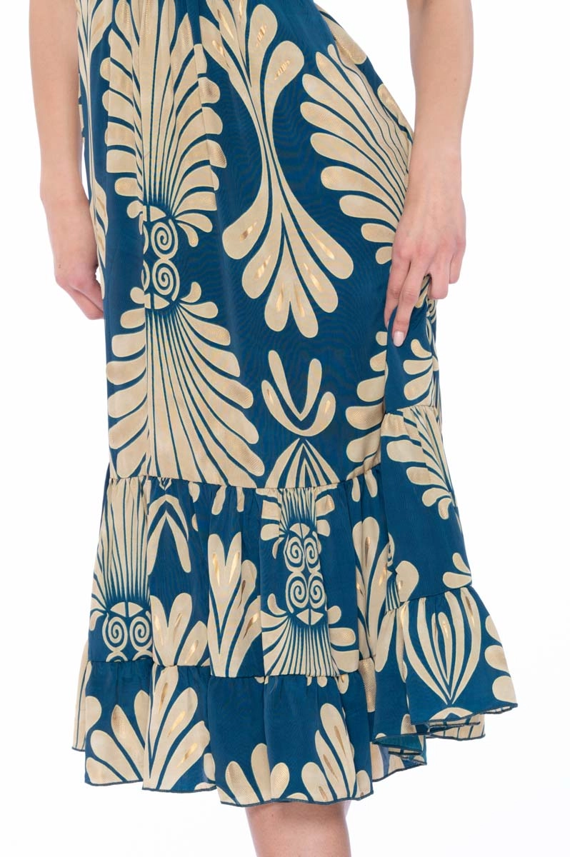 Midi dress made from Indian silk with a pattern in blue and cream tones enriched with gold details. The model features a crossed V neckline, straps and an elastic back that ensures comfortable wear.