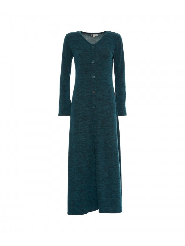 Long solid-colour dress by Baba Design, available in green or teal, featuring a small V-neckline, long sleeves and a row of tone-on-tone buttons on the front. The straight cut and front slit make this style comfortable for everyday wear. The length enhances the silhouette, while the soft fabric ensures a comfortable fit.