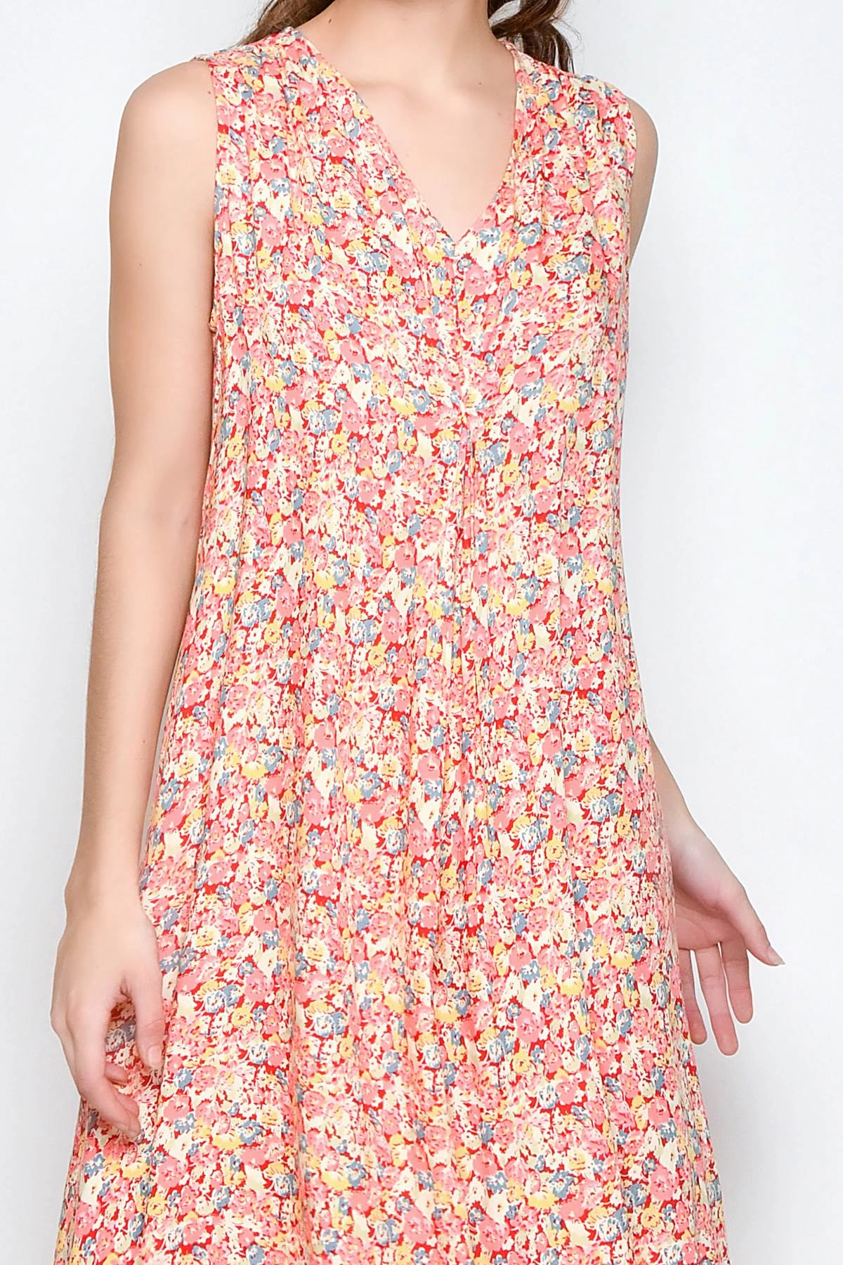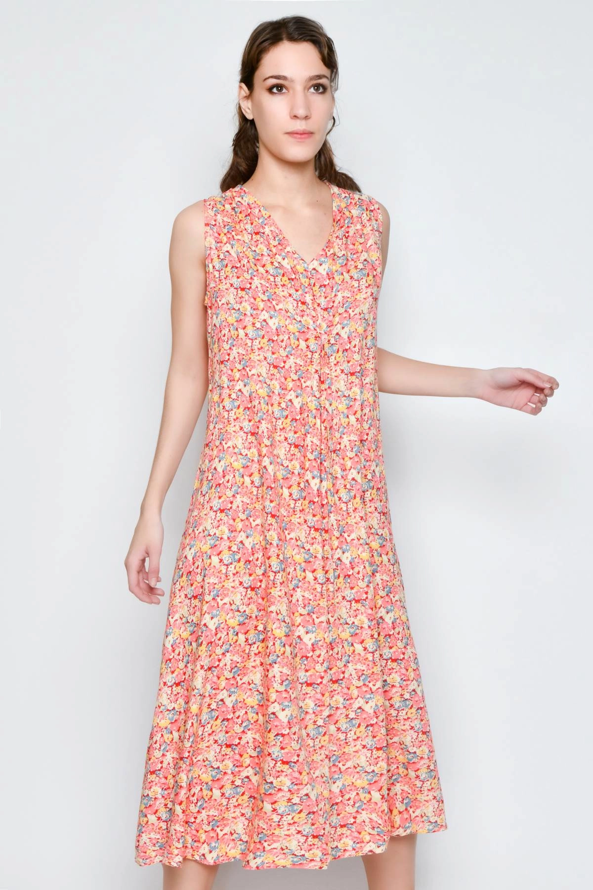 Women’s long sleeveless dress with a V-neckline, made of lightweight rayon. The model features central darts on the bust and a fluid fit that falls softly on the body. The multicolour floral print makes it ideal for summer days, holidays and informal occasions.