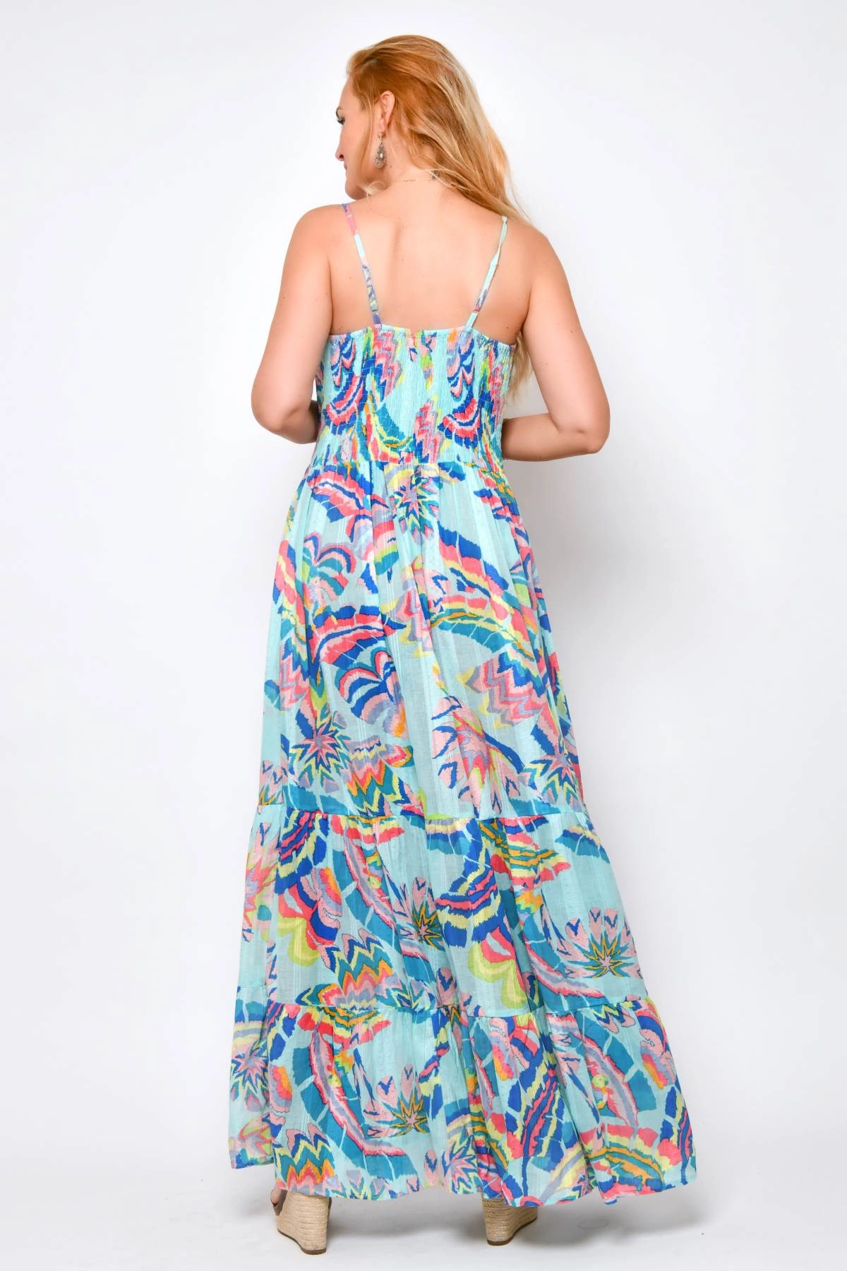 Women’s long summer dress with multicolour abstract print and adjustable thin straps