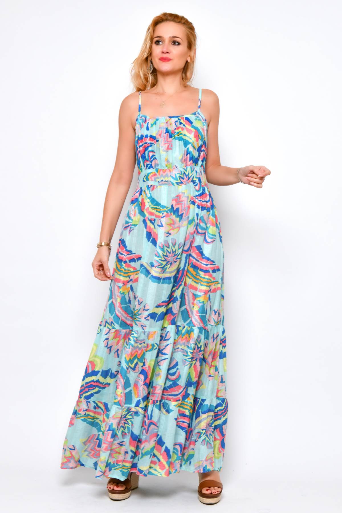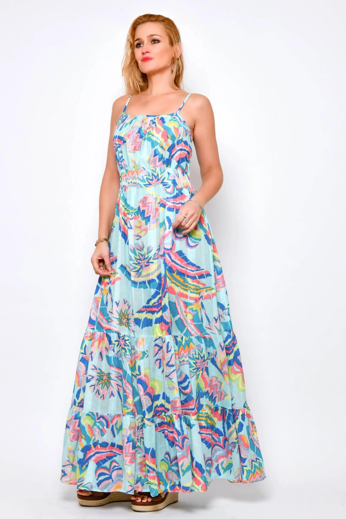 Women’s long dress with adjustable thin straps and an abstract multicolour pattern. The model features a fluid fit with a defined waist, elasticated back and a ruffled hem. Made of lightweight viscose, it feels fresh and pleasant on the skin during hot days; the fabric may appear slightly sheer when exposed to direct light.