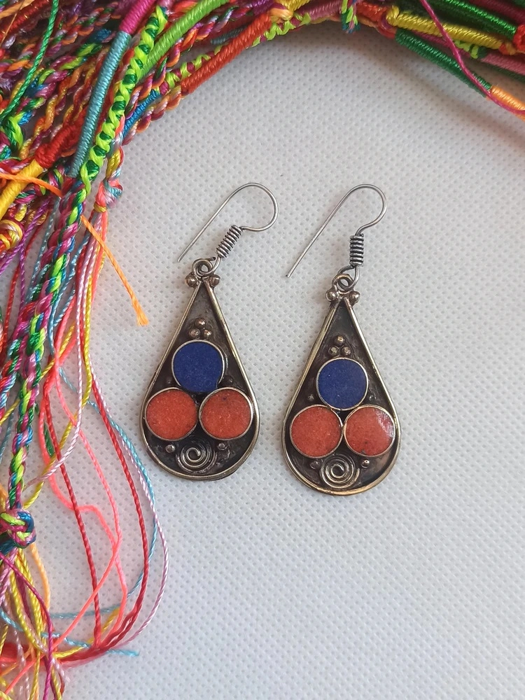 Handcrafted earrings crafted from German silver with a semiprecious stone mosaic insert in intense blue and red hues, according to ancient Nepalese tradition. In Nepalese symbolism, blue represents protection and spirituality, while red symbolizes vital energy and good luck.
