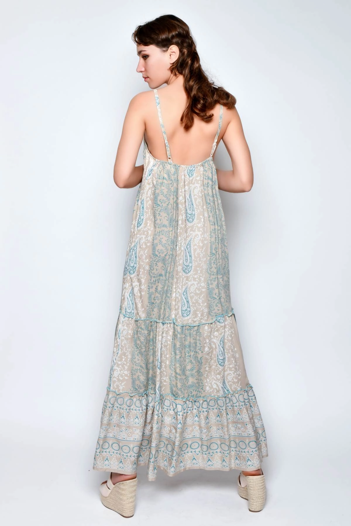 Women’s long dress with adjustable thin straps and a Paisley print in white and green tones on a camel-coloured background. The decoration is enhanced with hand-sewn gold sequins and beads that add refined light and detail. The silhouette falls softly on the body and is finished with a ruffled hem. Made of rayon, a plant-based fibre derived from cellulose, it is fresh, lightweight and pleasant on the skin, ideal for the summer season. Ethnic chic style.