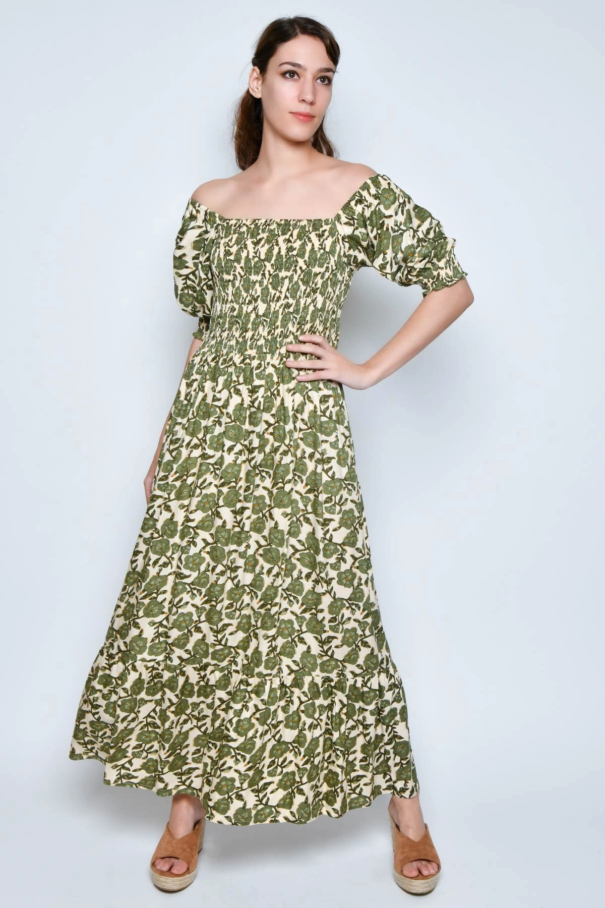 Women’s long summer dress in authentic Ibiza style, defined by a fluid and feminine silhouette designed to enhance the figure. The rayon fabric and the green floral pattern in natural tones make it ideal for the summer season.