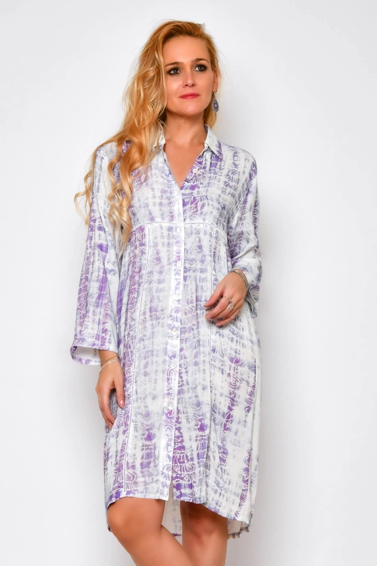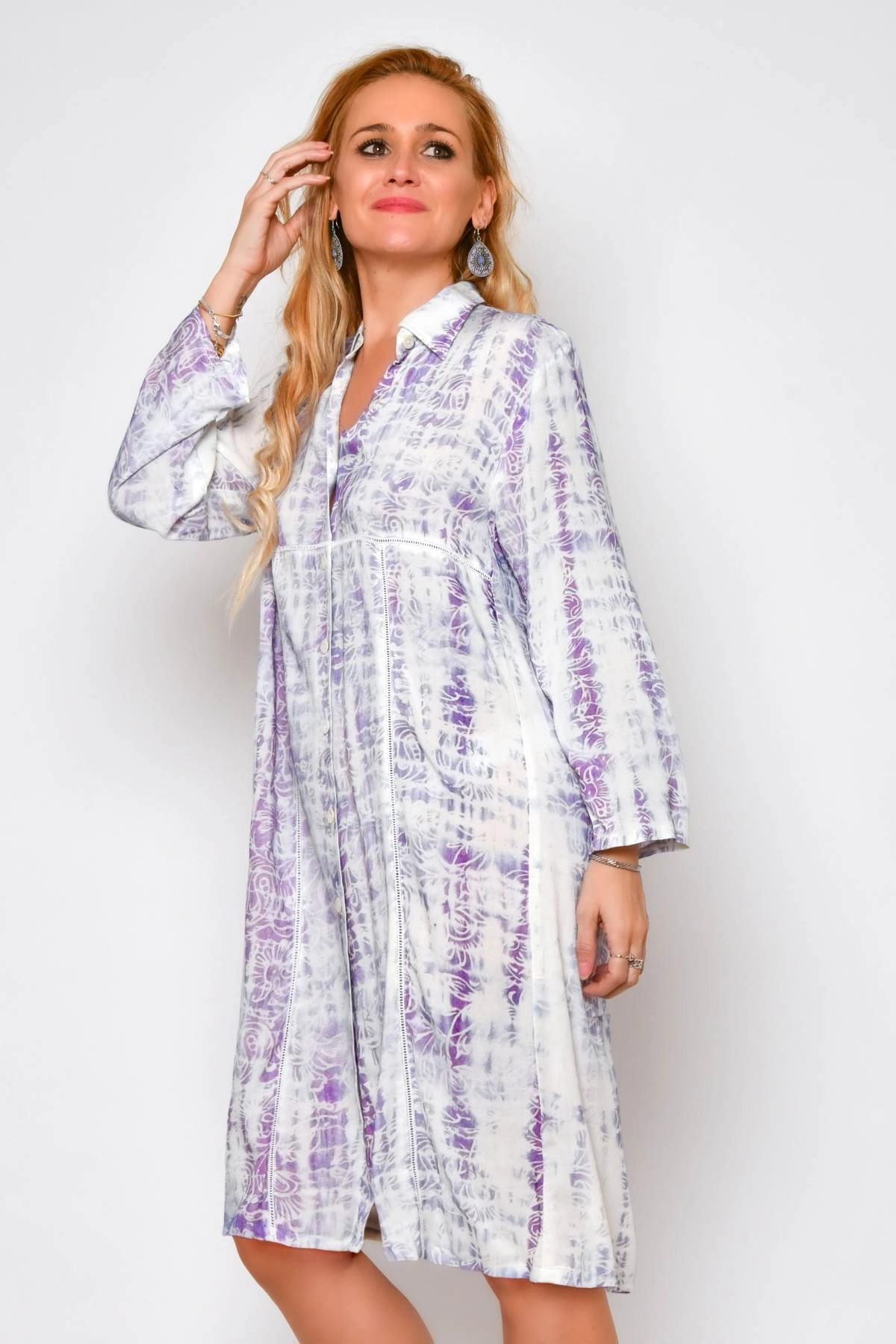 Women’s summer dress made of lightweight viscose, fresh and pleasant on the skin. The tie-dye pattern in white and purple tones creates a soft shaded effect, typical of boho style, easy to match and always on trend. The model features a shirt collar with full front button closure, a practical solution that makes the dress comfortable even on the hottest days. The cut allows the dress to fall softly over the body without clinging, enhancing the silhouette in a natural way.