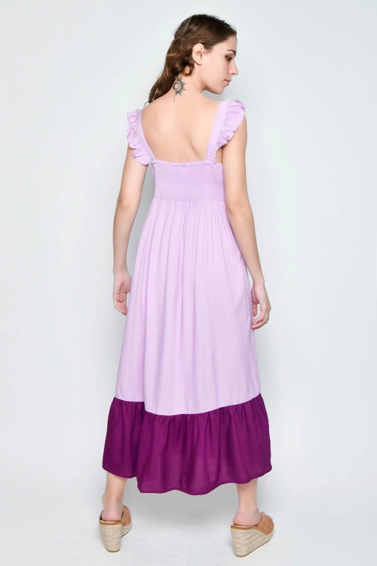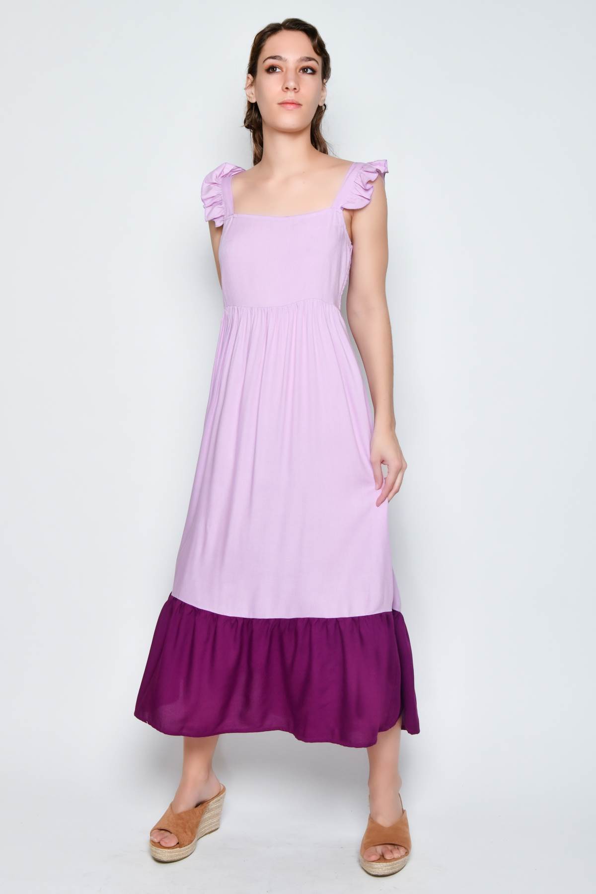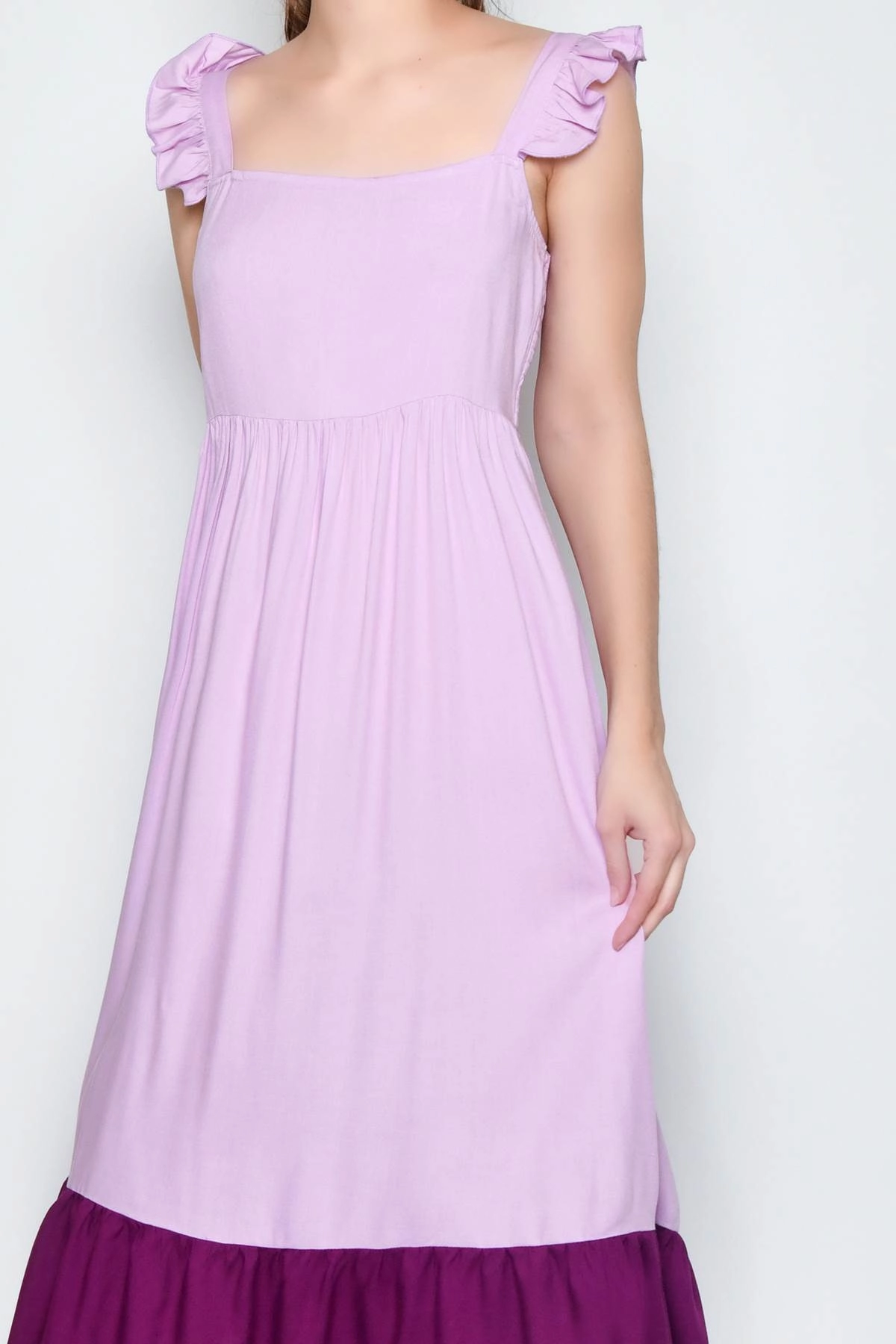 Casual summer style, suitable for hot days, holidays, walks and informal occasions. The colour combination is light lilac with a darker lilac contrast hem, easy to style. Pair it with flat sandals or natural wedges and a straw or fabric bag.