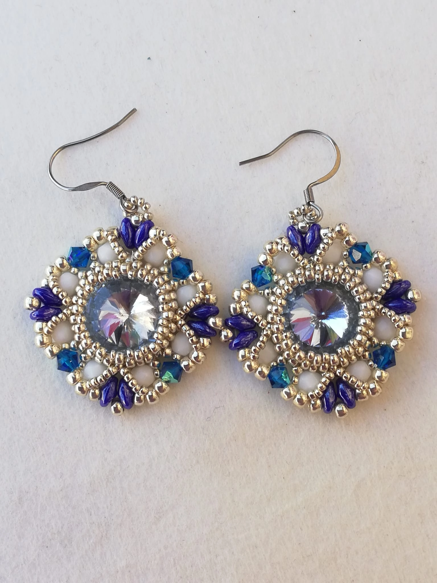 Handmade earring. Exclusive piece. The earrings have been handcrafted using the 'Bead Weaving' technique with 14 mm central rivulets, white half-crystals and 4 mm preciosa blue bicone. These earrings are unique pieces and cannot be reproduced. The clasp is made of steel.