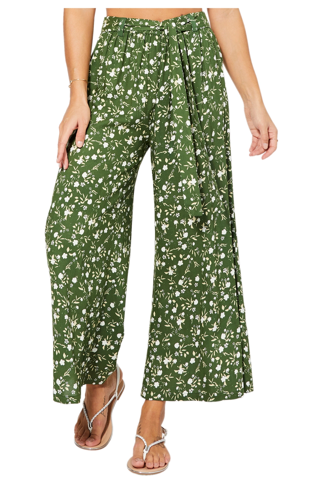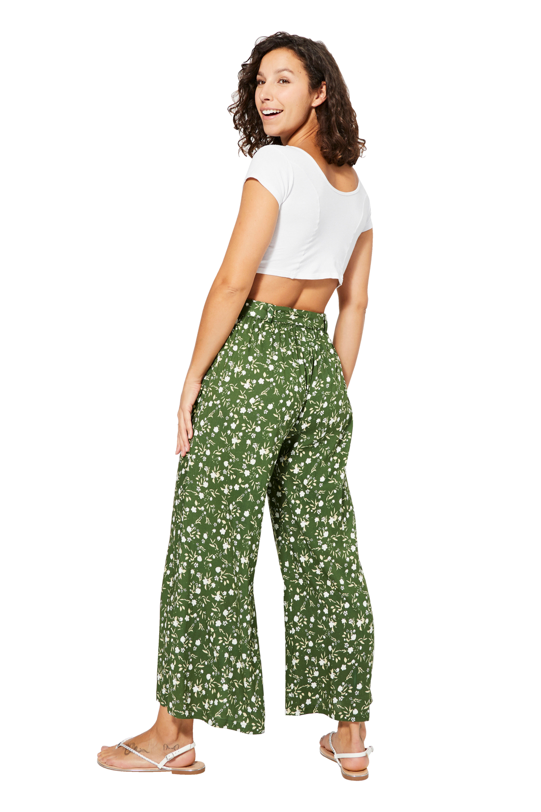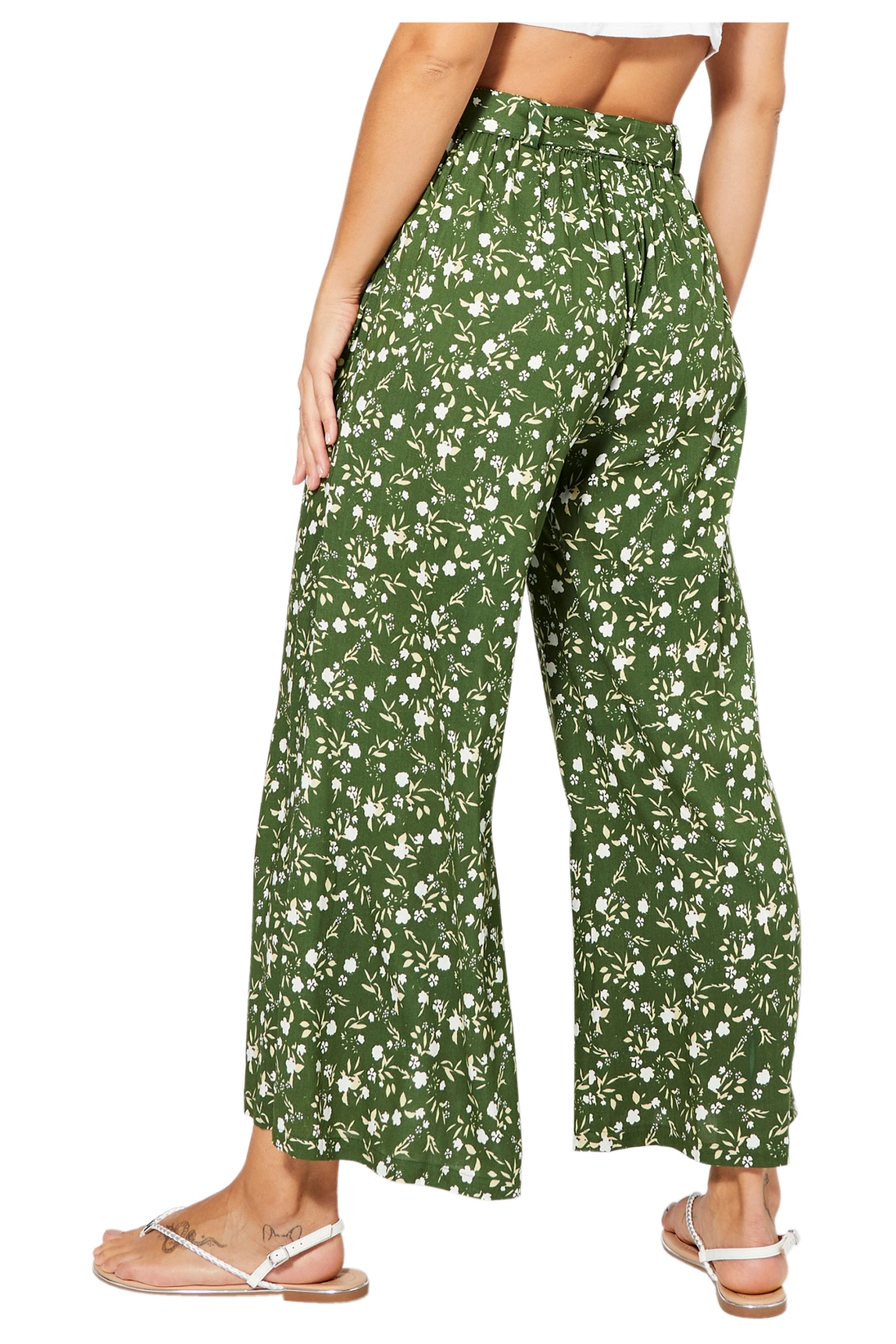 Viscose trousers with a green bottom and small light flowers. The model has a soft line, with an elastic waist that makes them comfortable to wear and suitable for different sizes. A lightweight garment, perfect for the summer.